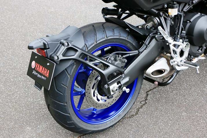 リアタイヤは190/55 R17と、このクラスのバイクとしては一般的なサイズ。スイングアームマウントとされたナンバープレートホルダーがかっこいい