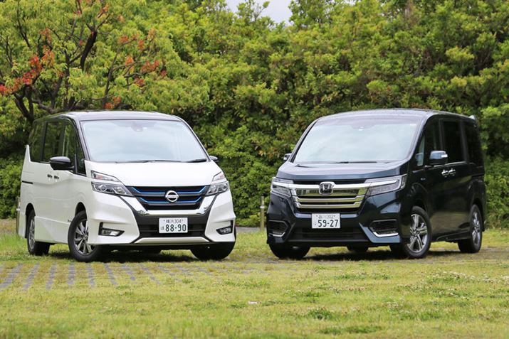 左は日産「セレナe-POWER」、右はホンダ「ステップワゴンスパーダHV」。ミドルクラスミニバンでは3列目シートも快適に過ごせるが、車両価格が高くなってしまう