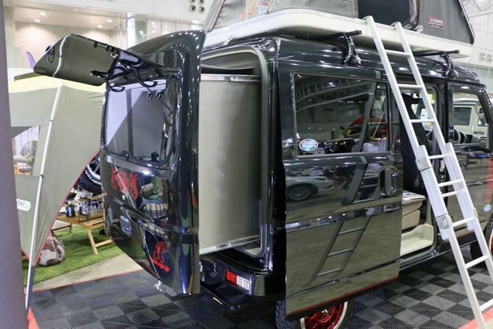 車体後部を引き出し、室内スペースを拡張するというオプション仕様も提案。軽自動車の限られた車内を拡張する仕掛けとしてはおもしろい発想だ