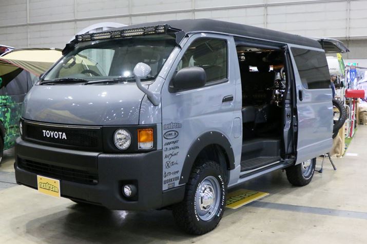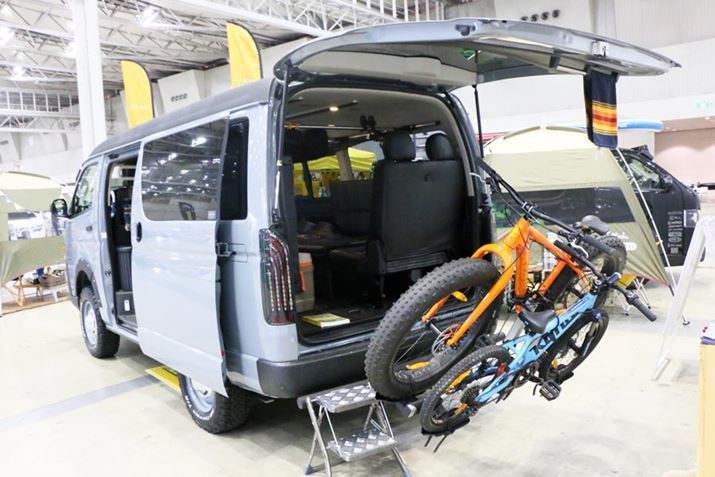 トヨタ車のカスタマイズパーツなどを手がけるモデリスタ仕様のハイエースは、車内に自転車を積み、趣味の道具と一緒に出かけて泊まれる“ハイエースらしい”魅力をアピール。近年、種類が増えてきたルーフテントも装備され、4人乗車・4人就寝(ルーフテント使用時)を可能とした。