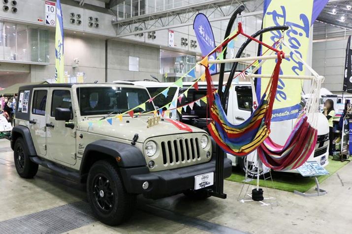ジープ「ラングラー」のフロント部に、ハンモックをぶら下げた車両。何度か足を運んだが出展者に会うことができず、販売されているかはわからなかったが、おもしろいアイデアだ