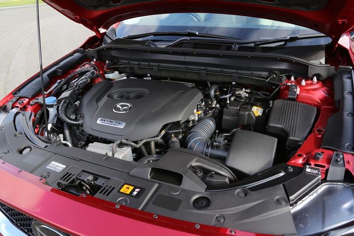 マツダ「CX-5」2.5Lガソリンターボモデルのエンジンルーム。エンジンスペックは、最高出力が169kW(230PS)/4,250rpm、最大トルクが420N・m(42.8kgf・m)/2,000rpmを誇る。
