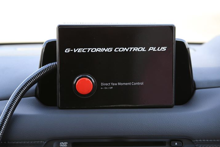 試乗車のマツダ「CX-5」には、「GVCプラス」の作動をオン/オフできるボタンが特別に設置されていた。市販車にはない、テスト車向けの仕様だ。