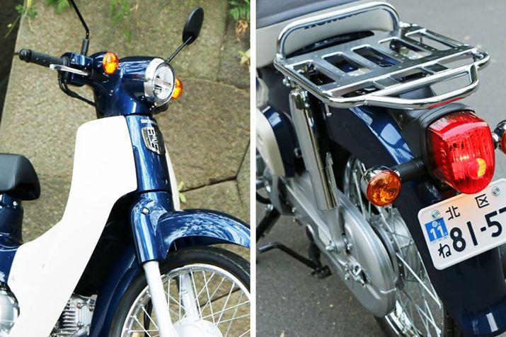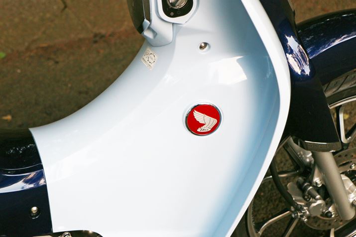 濃淡は異なるものの、スーパーカブ C125の配色はC100を彷彿とさせる“青×赤”。発色は、現代っぽい
