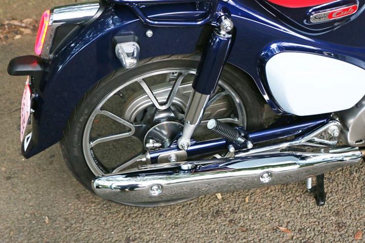 リアのサスペンションストロークはスーパーカブ110より19mm伸ばされ、ブレーキはドラム式を採用。専用アルミキャストのホイールとメッキタイプとなったマフラーで質感も向上している