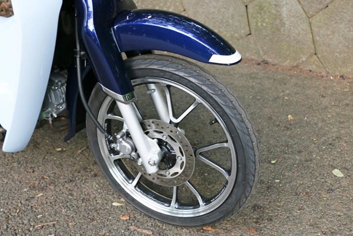 リアと同様にホイールはキャスト化。フロント側のブレーキがディスク式となったことで、余裕ある制動力を確保している。サスペンションのストロークは、スーパーカブ110より10mm長い
