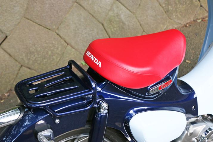シートもスーパーカブ50/110より前後サスペンションのストロークが伸ばされ、シートのクッションが肉厚となったため、シート高は高くなったのだが、足付きが悪くないのは、シートがやや絞られた形状になっているおかげだろう