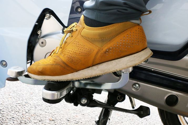 金属にラバーで滑り止めが施されたステップは、ホールド感がアップ。エンジンのケースやカバーもメッキ加工され、見た目の質感もいい