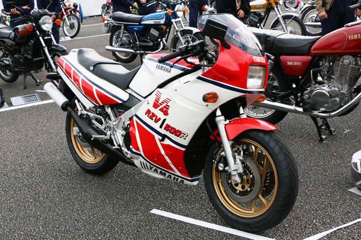 「RZV500R」は、2ストロークのレーサーレプリカとして忘れてはならない存在だ。当時の世界GPの最高峰クラスに参戦していたワークスマシン「YZR500」のエンジンを再現したV型4気筒500ccの2ストロークエンジンを搭載し、64馬力を発揮。車体をフルカバーするカウルを装備し、後方から見える4本出しのチャンバー(2ストの排気管のこと)も見る者の心を熱くさせた。当時は400ccオーバーのマシンに乗るための大型自動二輪免許(その頃は、免許の中型限定がなくなることから「限定解除」と呼ばれていた)の取得が難しかったこともあり、販売台数は多くなく、今となってはかなり貴重なマシンである。