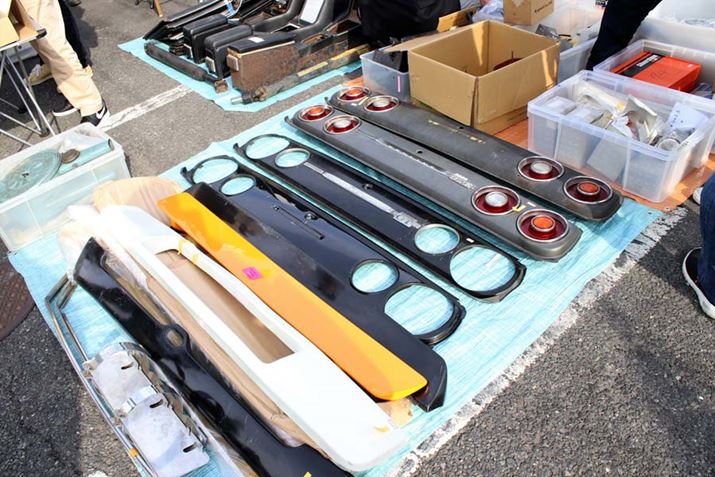 積み上げられた懐かしいプラモやミニカー、絶版車のパーツなどが販売されているのは、旧車イベントならではだ