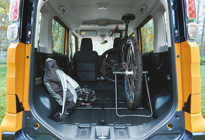 スズキ「スペーシアギア」のラゲッジルーム。フロアが防汚仕様のため、泥のついたMTBなどもそのまま入れることができる