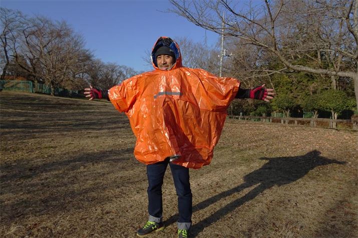 -20〜80度の広い温度範囲に対応するポンチョ。ペラペラしてますが、意外としなやかで動作音は少なく、気温0度でもかぶると体温を逃さない感覚がありました。視認性も高そうです