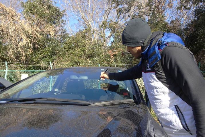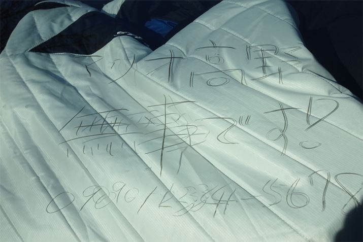クルマのウインドウに文字が書ける色鉛筆。エンコしたクルマから離れる際にメッセージを残すのに便利。雨程度では消えませんが、乾いた布で拭くと取れます
