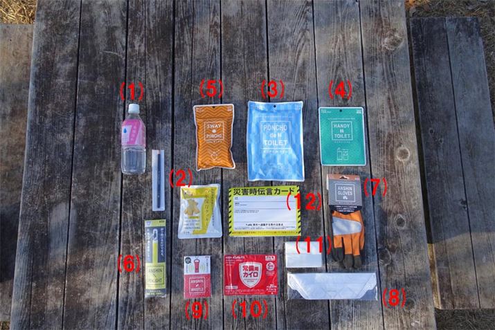 クルマで立ち往生したときなど、緊急時に役立つ12点の防災アイテムがセットになっています。長期保存ができる最低限度の食べ物と水、寒さに耐えるための防寒グッズ、作業用のグローブ、居場所を知らせる笛、最低限のプライバシーが確保できる簡易トイレなど、イザというときのためにトランクに1つ積んでおきましょう。