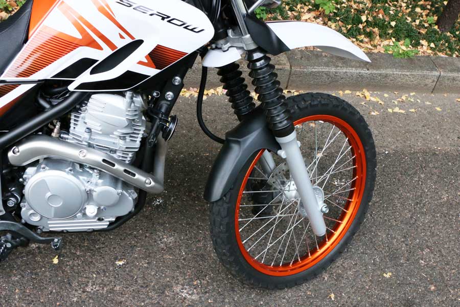 オフロードバイクとしては一般的な21インチのフロントホイールを装備。サスペンションは剛性の高い倒立式ではなく、細めの正立式を採用する。むやみにストロークや剛性などを求めない本機の哲学が感じられる部分だ