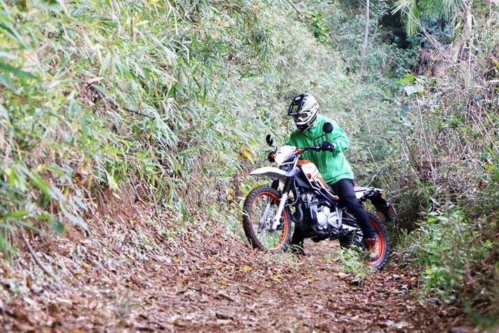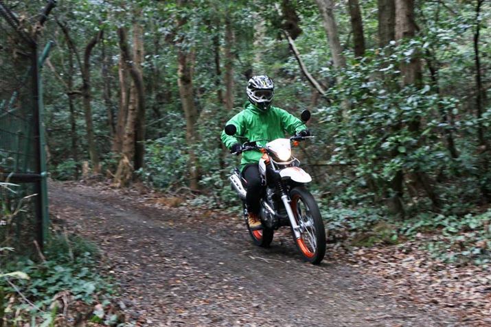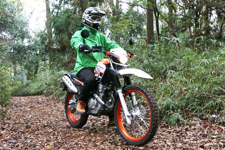 あまりの乗りやすさにテンションが上がり、ぬかるんだ登りにもチャレンジしてみた。路面はかなり粘土質で、雨の後でもないのにかなりすべる。エンジンのパワーをかけて登ろうとするとタイヤが路面をかき、ヌルヌルの粘土質が露出し、空転してしまうため、下手にアクセルを開けると車体が横を向いてしまう恐れがある。そんな状況で威力を発揮したのが、低速回転のトルクフルなエンジン特性と足付き性のよさだ。止まってしまうほどのゆっくりとした速度からでも、両足を路面に付きながらジワジワとアクセルを開けていけば、トコトコと歩くように登って行ってくれる。いたずらにパワーを求めるのではなく、“2輪2足”で扱いやすさを追求したセローが、ほかのハイパワーなオフロードバイクよりも長く支持されている理由を体感することができた。