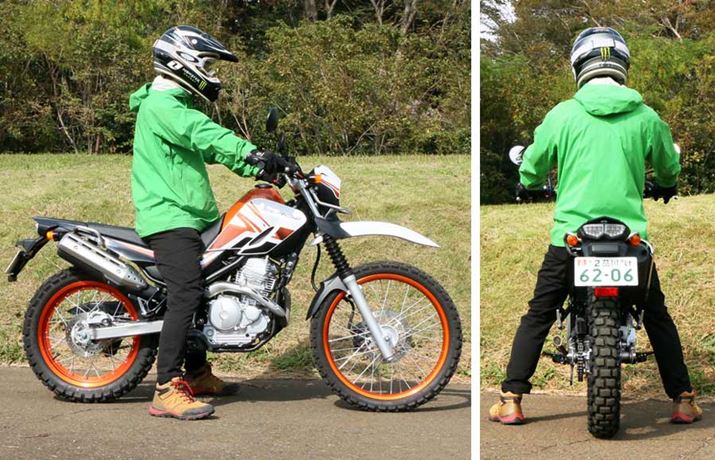 公道を中心とした山道での走行やツーリングに対応したトレールモデルであるセローは、シート高が低め。身長175cmの筆者がまたがってみても、両足のかかとまでベッタリと接地する