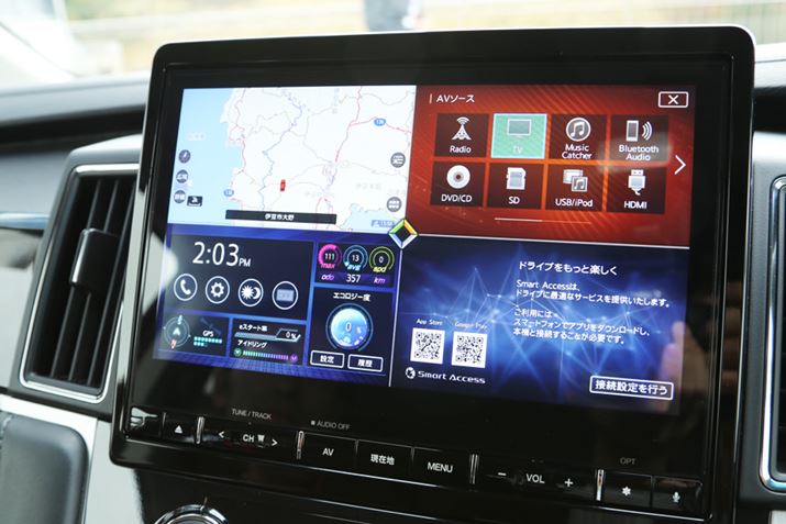 このナビは、「Quad View」という商品名が表すように、ディスプレイをナビ、AV、ツール、アプリの4つのエリアに分け、同時表示はもちろん、簡単な操作でレイアウトの入れ替えや4画面の大きさを変更できるというすぐれものである。9型でも、その能力は十分に堪能できるが、さすがに10.1型は画面がさらに大きく、視認性は抜群だ。