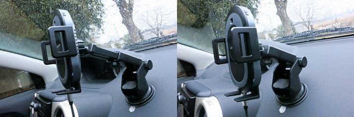 アームによって、手前へ最大で5cm動かすことができる(左画像)ので、たとえばスマートフォンでナビアプリを使うような際にも、見やすい位置に移動させることができる