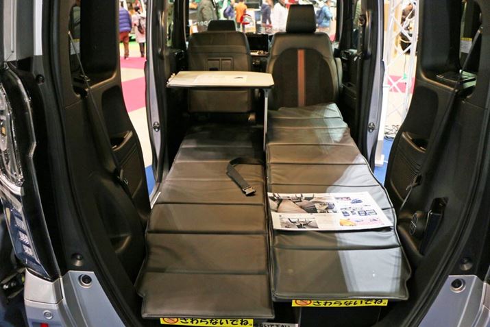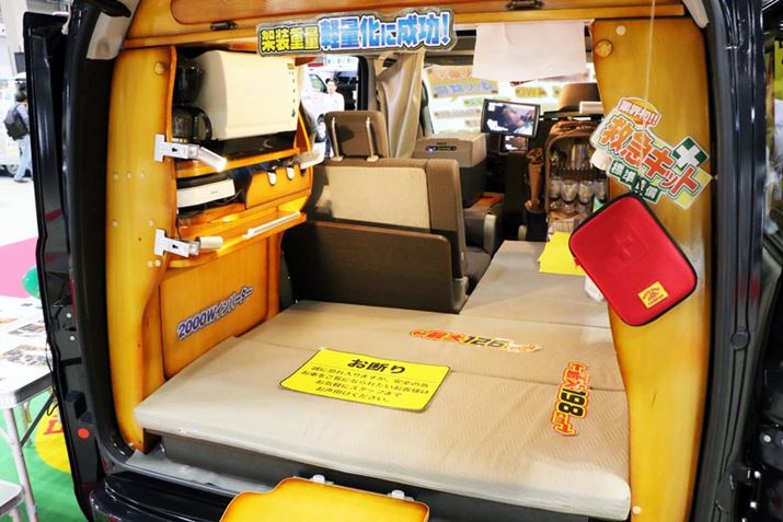 上で紹介した「N-BOX」を改装したキャンピングカーの車内。シートを倒し、マットを敷けば普通の「N-BOX」でもフラットな空間は作れるが、就寝スペースに段差を付け、1人分ずつに区切られているのは改造の工夫だ