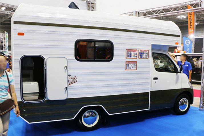 上が軽バン(日産「NV100」)をキャンピングカーに改造したもので、下が軽トラックの荷台にキャビンを設置したもの。居住スペースは狭めだが、細い道でも運転しやすいというメリットもある