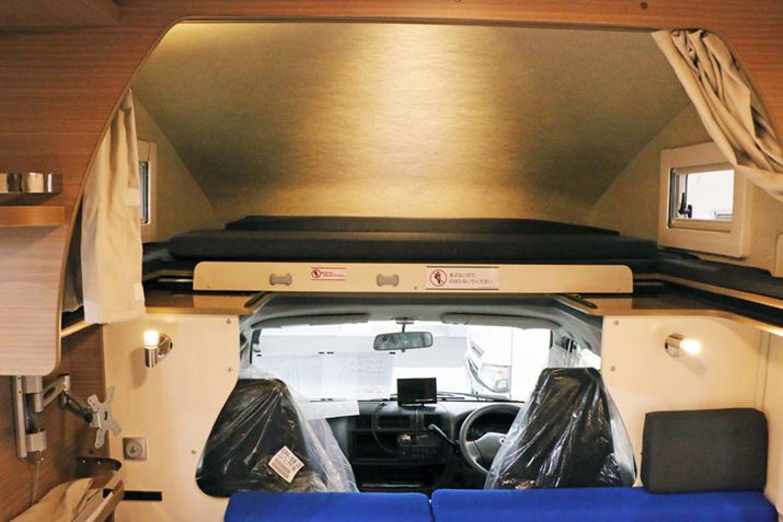キャブコンは運転席の上部にバンクヘッドを装備。手前に引き出すように展開すると、大人2〜3人が横になれるスペースが出現する