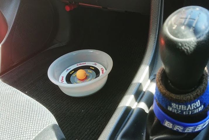 底の浅いすり鉢状のお盆の上に小さなボールを乗せただけという、実にシンプルなものですが、結論を先にいうと、自分の運転の雑な部分を自覚するのに極めて有効なツールでした。