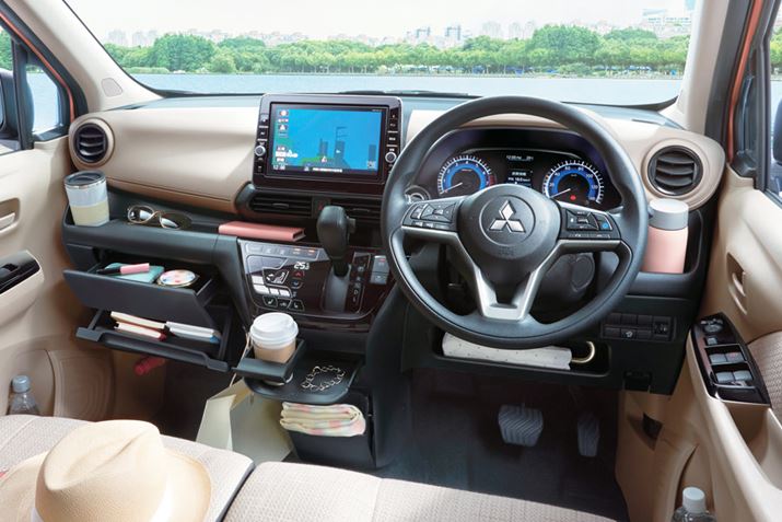三菱 新型「eKワゴン」「eKクロス」のインパネは伸びやかなデザインが採用されている。また、多くの小物入れやドリンクホルダーが用意されているのも、軽自動車ならではだ
