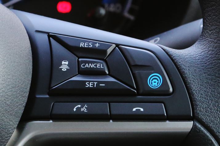 ステアリング右側にある「MI-PILOT」スイッチは、日産の「プロパイロット」と同様のスイッチの配置になっていて、使い方も一緒だ