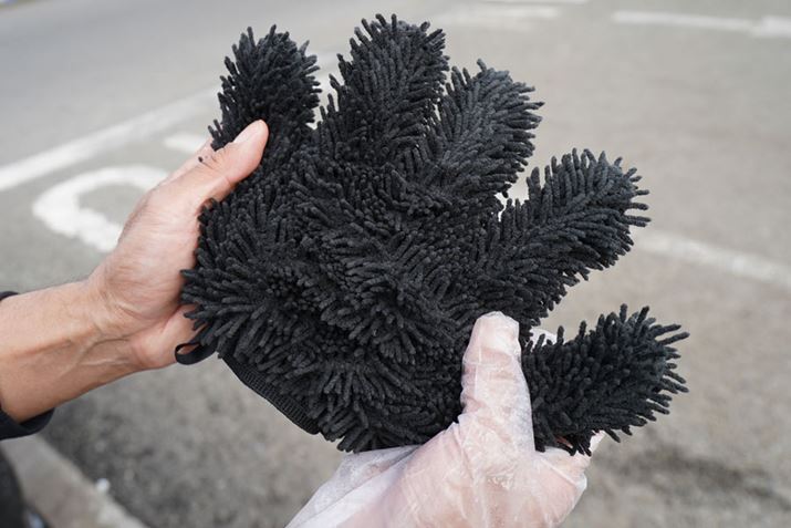 ボディ洗車用のボディ用グローブ「ゴリラの手」は、指が入らない隙間に毛先が入り込み汚れを絡め落とす「ツイスト面」と、虫汚れやしつこい汚れをガンガン落とす「クロス面」の両面2WAY構造ということですが、素手感覚で洗えるので、確かにボディの隅々までしっかりと行き届いた洗車が行えました。