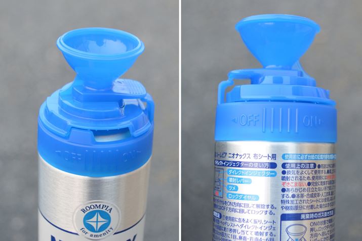 使い方は、スプレーの先を直接シートに押し付けるだけ。1回あたり1秒ほど、約30cm四方に1回を目安として噴霧。座面と背面はそれぞれ4~6回、ヘッドレストは1~2回程度がいいようです