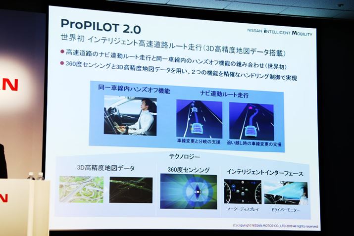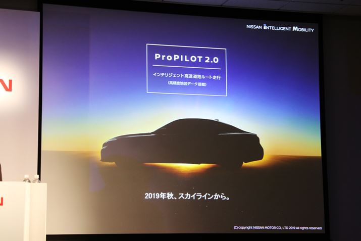 2019年5月16日、日産は運転支援システム「プロパイロット」の第2世代となる「プロパイロット2.0」を、2019年秋にマイナーチェンジされる「スカイライン」を筆頭に、順次日産車に搭載していくと発表した。