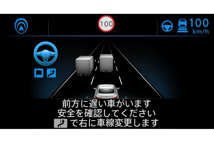 また、前方に遅いクルマが走っているときには、システム側が追い越しを提案してくれる。ハンドルに手を添えてスイッチを押すことで追い越しを承認すると、ハンドル制御によって右車線へと自動で車線変更が行われる。その後、追い越しが完了してシステムが安全に走行車線に戻れると判断すると、ふたたびハンドル制御によって走行車線へと戻ることができる。