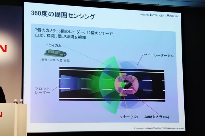 プロパイロット2.0では、搭載されるハードウェアも大幅に進化する。プロパイロットのセンサーは単眼カメラだけだが、プロパイロット2.0では、カメラが7個、レーダーが5個、音波ソナーが12個装着される。さらに、3D高精度地図データも搭載される。すべての高速道路において、区分線の情報や速度標識、案内標識などの情報を把握。この3D高精度地図データの内容と車載カメラからの情報を照合して、車両の置かれた状況を判断するのだ。車両の前後方向は1m、左右方向は5cmという精度の高さで、自車位置を把握できるという。