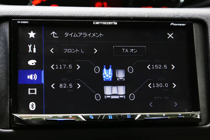 タイムアライメントは、ドライバーとスピーカーの距離の差による音場を最適化できる機能だ。カロッツェリアのサイバーナビなどには、専用マイクを使って簡単に理想の音響空間を構築できる「オートタイムアライメント&オートイコライザー」と呼ばれる機能があるが、FH-9400DVSに搭載されているタイムアライメントはそこまでの機能ではない。だが、調整すると音の定位などはかなり変化するし、前方定位を目指して自分好みの音場に調整していくのもおもしろいと感じた。
