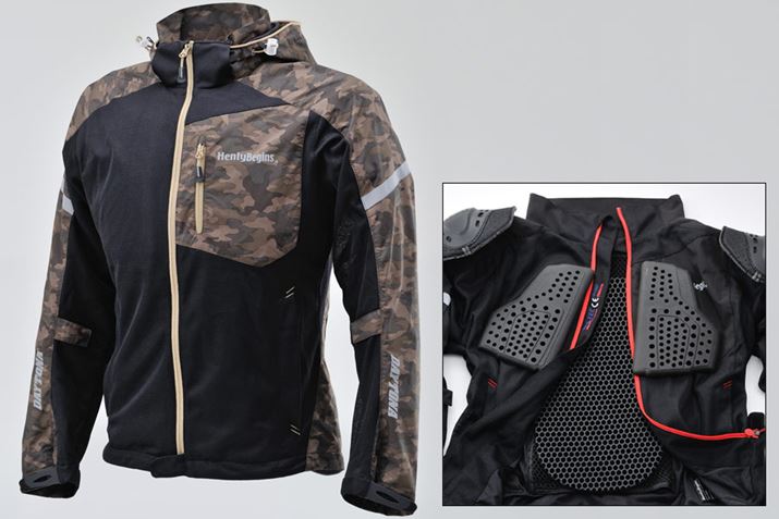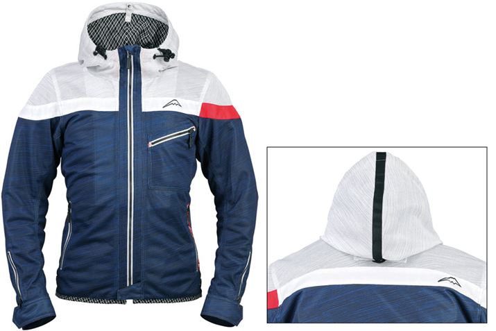 レース用の革ツナギなどで定評のあるクシタニから選出した「FULL MESH PARKA JACKET」は、ツートンカラーでやや派手な気もするが、実際に見ると色に落ち着きがあり、派手派手しさは感じない。生地は表地も裏地もメッシュ素材で、肩、肘、背中のプロテクターも通気性に配慮したベンチレーションソフトプロテクターとなっている。フードも付いているが、バタつきを抑えるループも装備されているので問題なし。少し丈は長めだが、前身頃が前傾しやすい作りになっているのも◎。