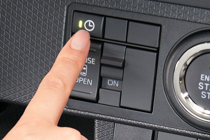 クルマに近づくだけで、パワースライドドアを自動でオープンさせることができる「ウェルカムオープン」機能は、インパネにある時計マークのボタンを押すことで予約することができる