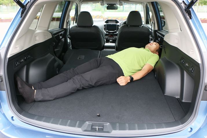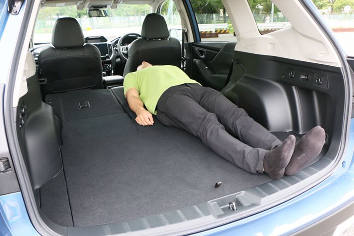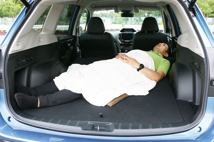 実は、荷室の長さを示すスペックには、フロントシート背面までの長さを指す「荷室長」と床面の長さを記した「荷室フロア長」がある。フォレスターの場合、荷室長は1,856mmで、荷室フロア長さは1,547mm。つまり、上の写真で頭落ちている隙間を省いた床面を測定した荷室フロア長をチェックしておかないと、横になれるサイズが正しくわからないのだ。しかし、多くのSUVには荷室フロア長が記載されていない。その点、フォレスターは荷室フロア長をしっかりと明示しており、実際に寝られるスペースがわかりやすくて好感が持てる。