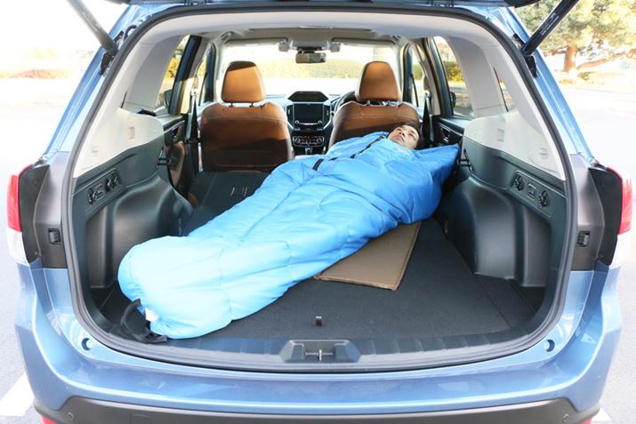 さすがに寒いので、エアマットだけでなく寝袋も使用。なお、夏に試した車体とグレードが異なるため、内装は違うが、こちらも5代目フォレスターだ