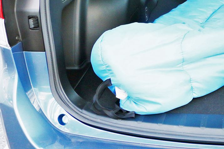 ベストポジションが見つかったので、就寝の準備。車中泊した日は日中の気温が25℃を超え、夜間も15℃くらいだったので、タオルケットをかけるだけで十分そうだ。シートの背面が寝床となるため、クッション性のあるマットも忘れずに敷こう