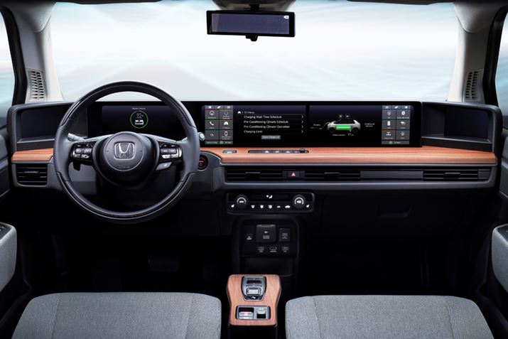 木目パネルと液晶ディスプレイに囲まれた、独特なホンダ「Honda e」のインパネ。左右には液晶ミラーのためのディスプレイも備わっている