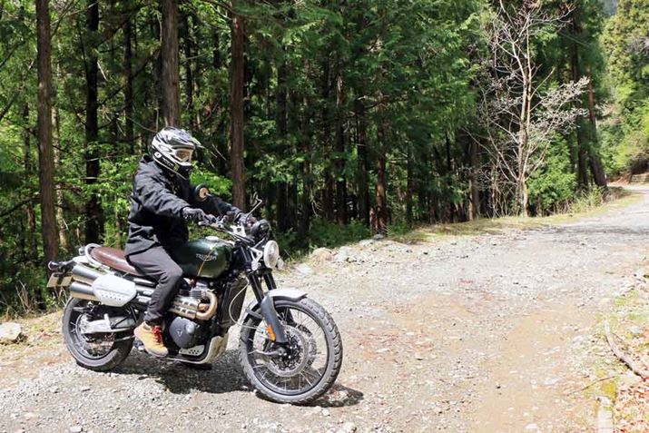 スクランブラー1200 XCには「ROAD」「OFF-ROAD」「RAIN」「SPORT」「RIDER」という5種類のライディングモードが搭載されており、ここまでの峠道はSPORTモードで走ってきた。そのままのモードで林道に突入してみたところ、車体がなかなか前に進まない! 実は、トラディショナルなデザインのマシンではあるものの、最新のトラクションコントロールが装備されているため、後輪がすべるとそれ以上駆動力がかからないようになっているのだ。砂利道とはいえ、グリップの低い林道ではリアタイヤがすべりながら走るもの。駆動力が抜けてしまうと、進まないのは当然だ。そこで、OFF-ROADモードに切り替えてみた。すると、後輪がすべると少し駆動力は弱まるものの、着実に進む! 林道をスムーズに走行することができた。