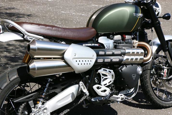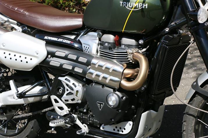 2本出しのアップタイプのマフラーは、スクランブラーらしいスタイル。排気音は近年のバイクの中ではかなり迫力がある