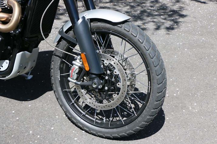 フロントのホイールサイズは21インチ。ブレーキにブレンボのモノブロックキャリパーをダブルで装着し、制動力を高めている。通常、オフロード車はシングルディスクなので、この点はオンロード車に近い