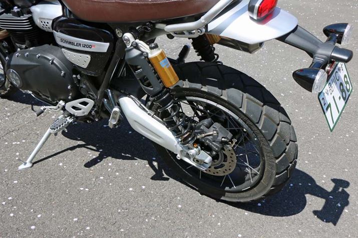 スクランブラー1200 XCには空冷エンジンのようなフィンが装備されているが、れっきとした水冷モデル。1,200ccの並列2気筒エンジンを搭載し、最高出力は90PSで、最大トルクは110Nm。同社のオンロードモデル「ボンネビル スピードツイン」と同じ排気量と形式ではあるが、オフロードでの扱いやすさを重視したためか出力は7PSほど抑えられている。そして、足回りに目をやると、オフロード走行を意識していることを感じさせる200mmという長いストロークのサスペンションが目を引く。リアサスペンションは2本タイプとなっているが、この長さのサスペンションは存在しなかったため、特注で作ったという。フロントサスペンションも倒立式で、見るからに剛性が高そうだ。このほか、ホイールもオフロード車で用いられるスポークホイールとなっている。