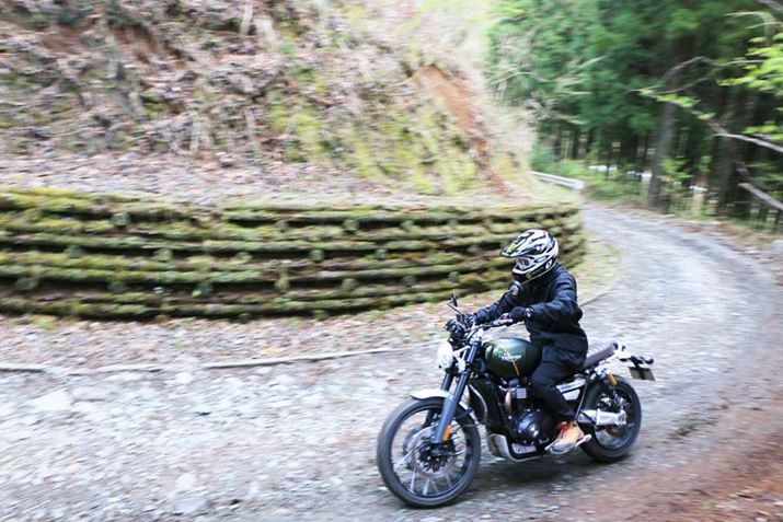 未舗装のコーナーを曲がるのも、直線でしっかり速度を調整しておけば何ら不安はない。車重があるので、あまり車体をバンクさせると立て直すのが大変そうなイメージもあるが、タイヤのグリップが限界を超えなければ結構スムーズに曲がることができる。前に座って前輪に荷重をかけ、後ろをすべらせるような“今風”のオフロード車のような走り方はできないものの、スクランブラーが全盛だった時代はこのポジションで走っていたことを考えると、それはそれで味わい深い。