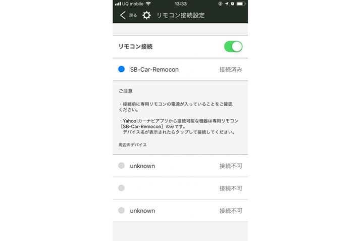 Yahoo!カーナビのメニューを開いて「アプリの設定」→「リモコン接続設定」に進み、表示されている「SB-Car-Remocon」をタップ。「接続済み」と表示されればペアリングは完了です。SB-Car-Remoconが表示されない場合は、リモコンの電源が入っているか、スマートフォンのBluetoothがオンになっているかなどを確認しましょう。