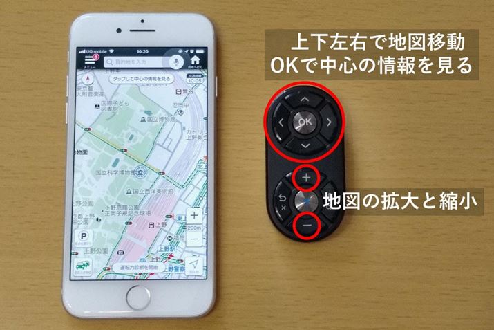 地図の移動は「方向」ボタン、地図のズームは「+」「−」ボタン、中心の情報を見るには「OK」ボタンを短押しします