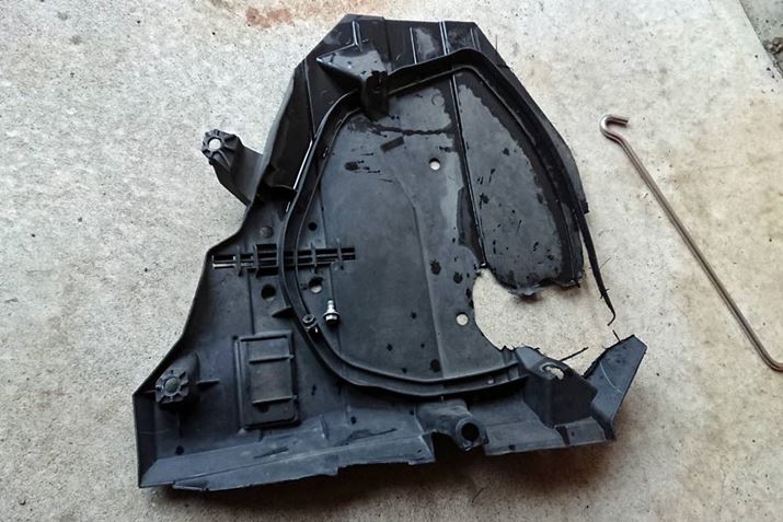 これは愛車の車体の下側にある燃料タンクを守るための樹脂カバー。当然ながら、クルマの裏側やタイヤハウス内には常に泥汚れにさらされています