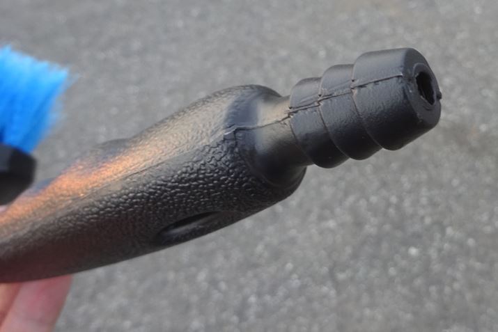 グリップのえの部分に穴が空いており、ホースを接続することで水を通しながらの作業ができます。状況が許せば、ぜひホースの水を利用して洗ってください